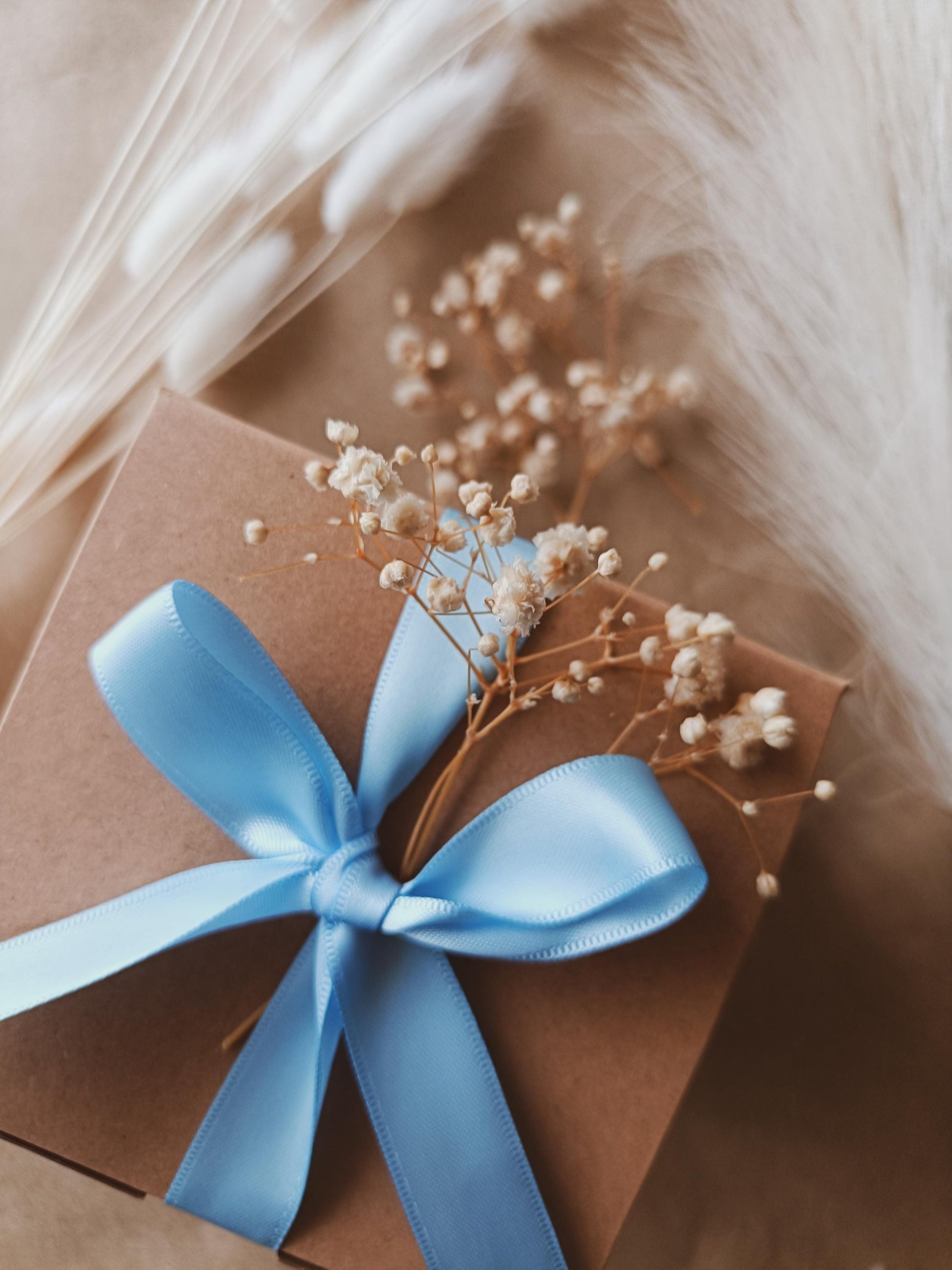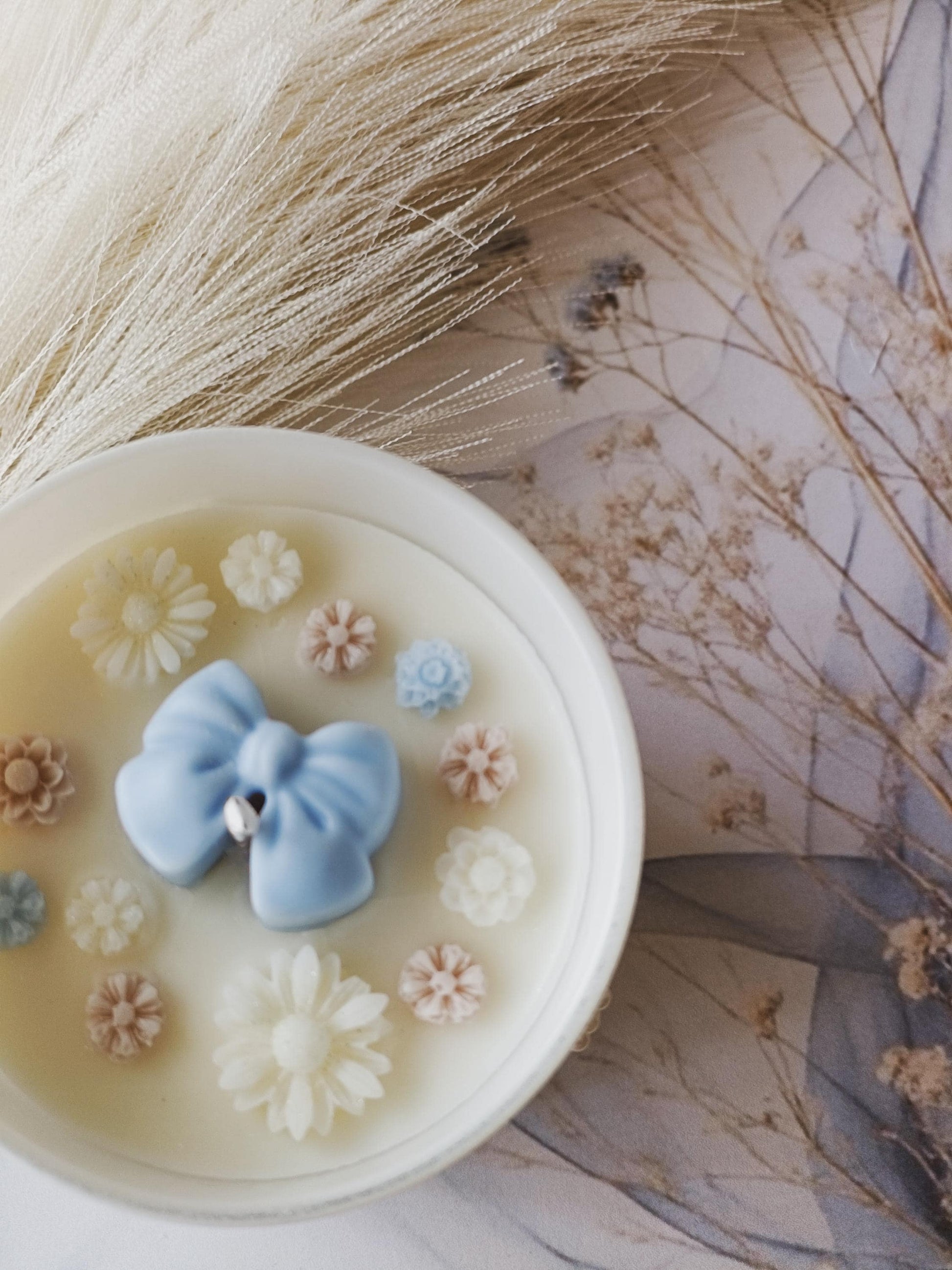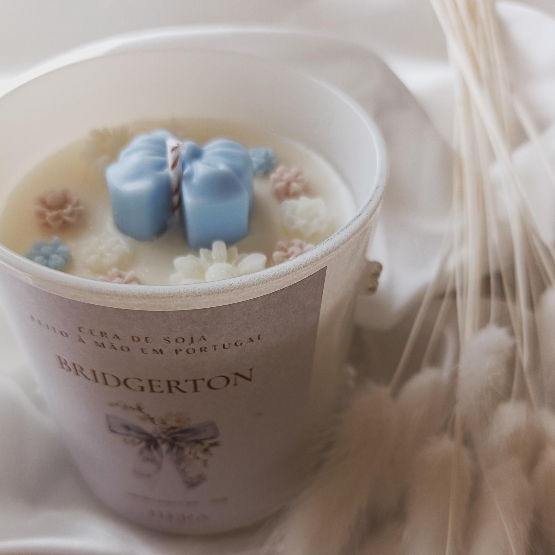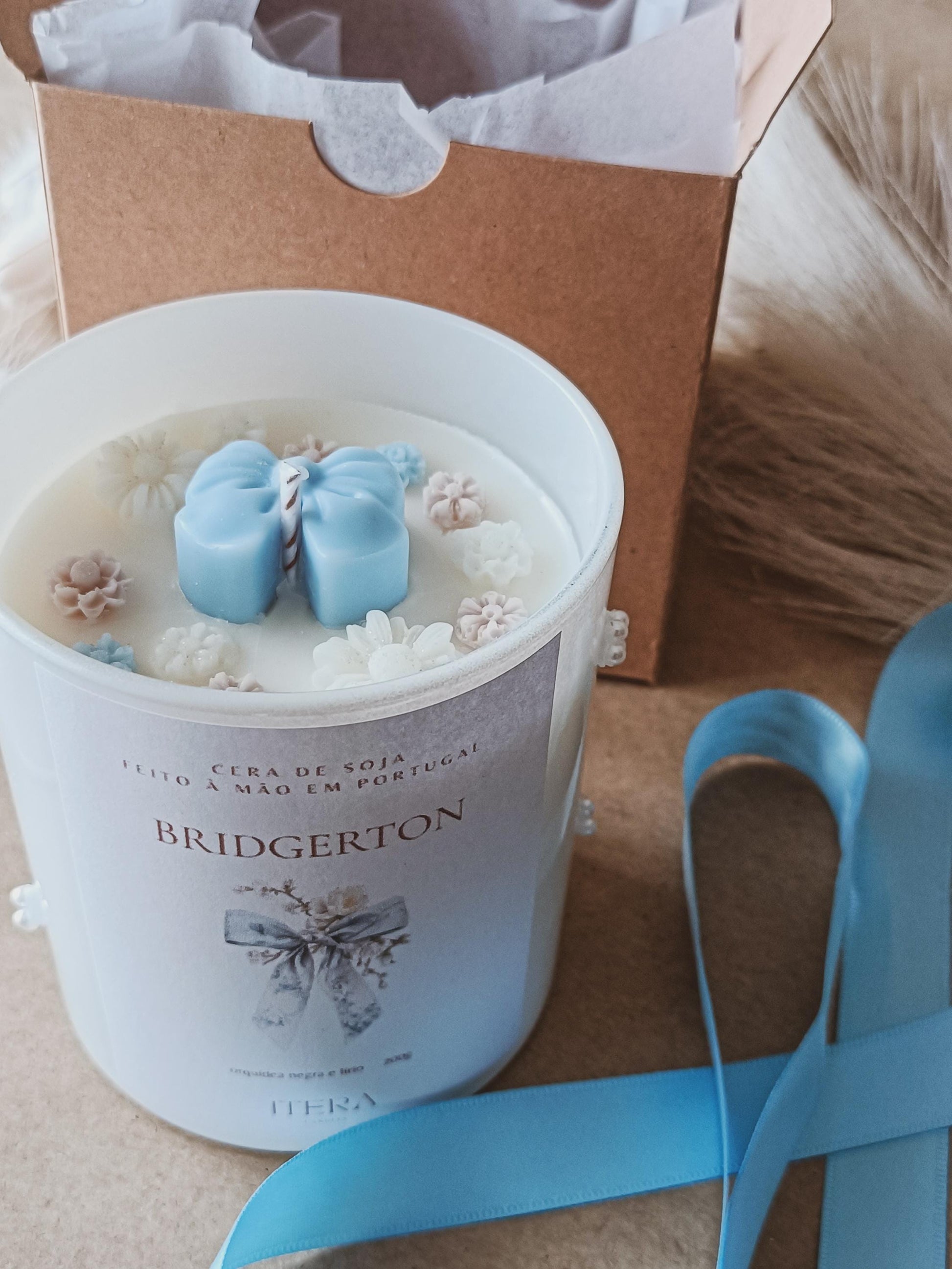 Com uma paleta suave em tons de azul, bege e branco, e um topo cuidadosamente decorado com um laço e flores, cada vela é feita à mão e preparada ao detalhe, desde a colocação da cera até ao laço final na embalagem.